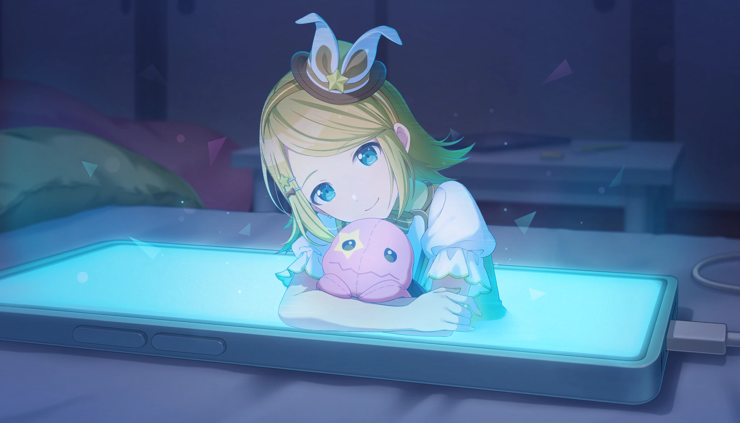 大きなリボンを着けたブロンドボブヘアが特徴的な少女バーチャル・シンガー。鏡音レンとはツイン・ボーカル。キュートで元気な見た目にぴったりな、チャーミングな歌声を持っている。